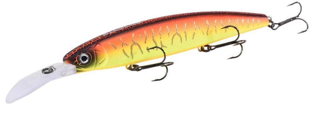 Wobbler para pesca em profundidades médias (0,9-1,5 metros). Possui 2 ganchos de suspensão triplos. Feito de balsa. Tem um jogo bastante animado e realista, que atrai um predador. Preço: 1060 rublos.