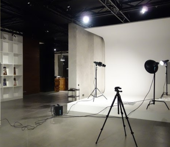 A área do estúdio é de 80m2. Três janelas para o chão. Interior escuro com paredes texturizadas. Possui um ciclorama angulado, um prato de beleza e uma máquina de fumaça.