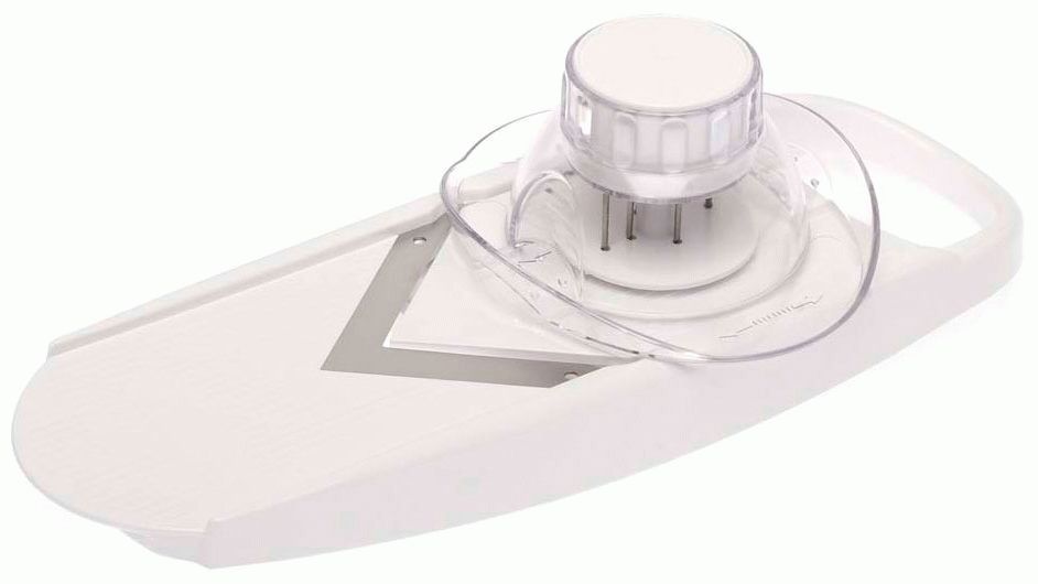 O design atraente e a compacidade do dispositivo, combinados com alta potência, colocam este fatiador nos lugares de classificação mais alta. Corpo dobrável em plástico, pés emborrachados, lâmina ondulada que permite cortar fatias de até 15 mm de espessura, inclusão segura. O preço é de 4200 rublos.