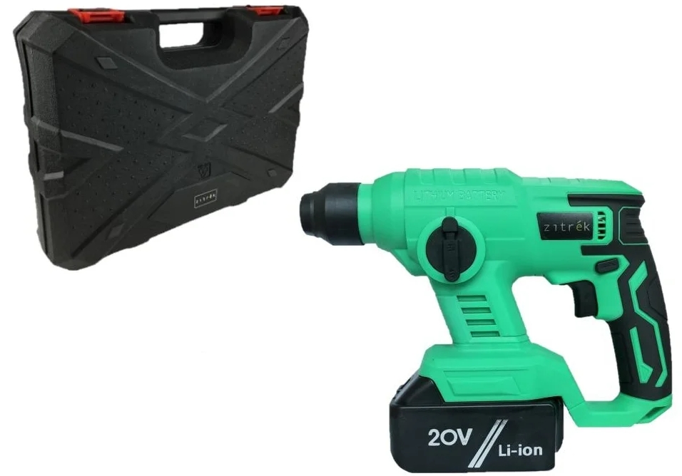 "Zitrek Destroyer 20 V" est conçu pour percer des trous, fabriquer des stroboscopes dans le béton, la brique, le béton cellulaire et d'autres matériaux durs. L'appareil est équipé d'un moteur puissant, d'une batterie haute capacité, d'une cartouche SDS-Plus standard solide. Une conception légère, une poignée supplémentaire et confortable créent toutes les conditions pour un fonctionnement efficace de l'outil.L'appareil dispose d'un interrupteur (marche arrière) pour la rotation avant / arrière de la perceuse, d'un indicateur de charge de la batterie.