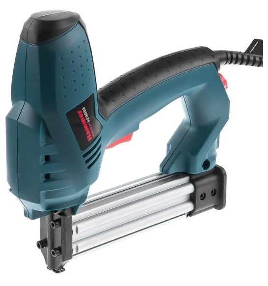 L'agrafeuse pour meubles fait un excellent travail d'assemblage de matériaux à l'aide d'équipements de différentes tailles. Convient pour les travaux ménagers. L'équipement du modèle avec des poignées ergonomiques contribue à une bonne prise en main et à la sécurité lors de l'utilisation. Le mécanisme d'impact ne nécessite pas beaucoup d'efforts à utiliser.