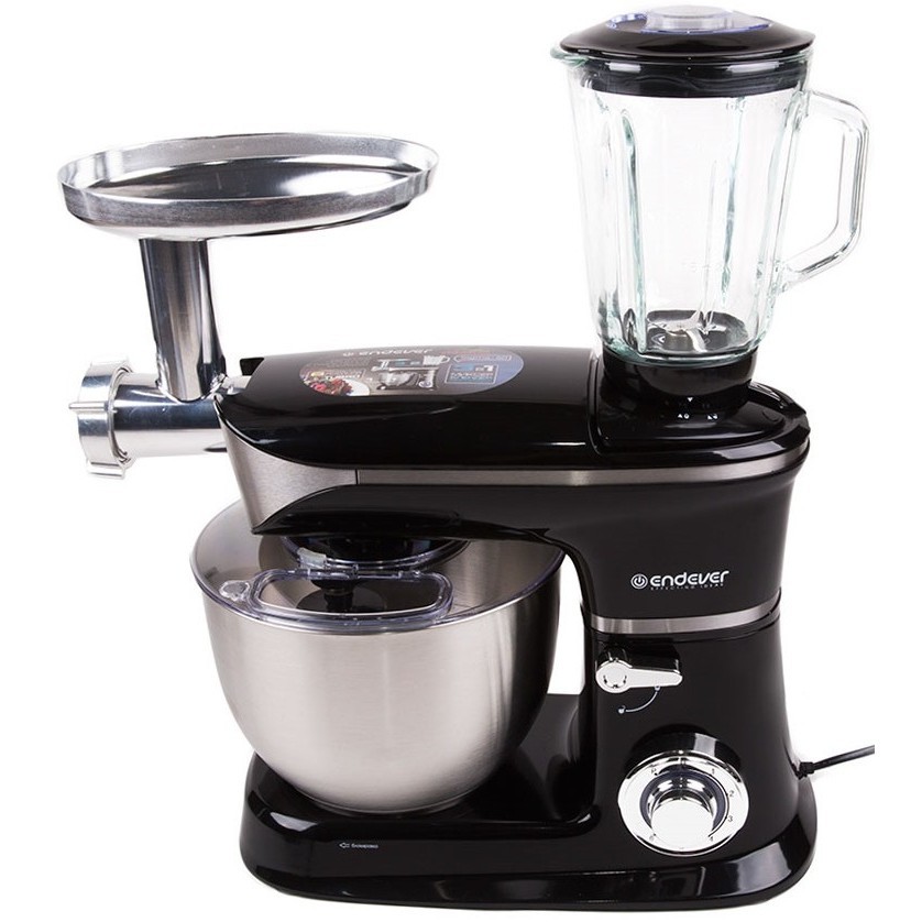 Un mélangeur en verre durable est monté sur le dessus. Un hachoir à viande avec des accessoires pour la viande hachée et les saucisses est installé devant.6 vitesses sont réglables en douceur, ont un mode de fonctionnement par impulsions.