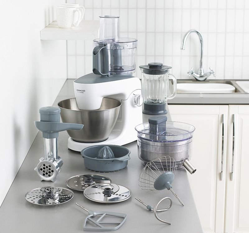 En plus de l'ensemble standard: mixeur, hachoir à viande, accessoire de pâte, le modèle comprend un broyeur, un mixeur, une râpe, un déchiqueteur.