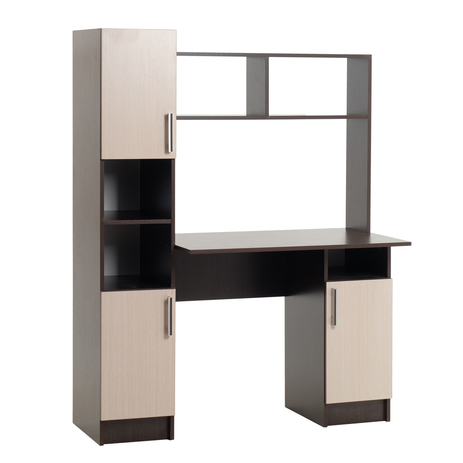 Petit mais spacieux, en aggloméré laminé, malgré sa taille, vous permet d'y placer tout ce dont vous avez besoin pour créer un espace de travail. Un moniteur est facilement localisé sur la surface, il y a des compartiments pour les documents et autres choses. En bas, il y a une plate-forme pour une unité PC, et il y a aussi une armoire avec des tiroirs. L'ensemble comprend une armoire avec quatre étagères et une superstructure avec des tiroirs ouverts et fermés.
