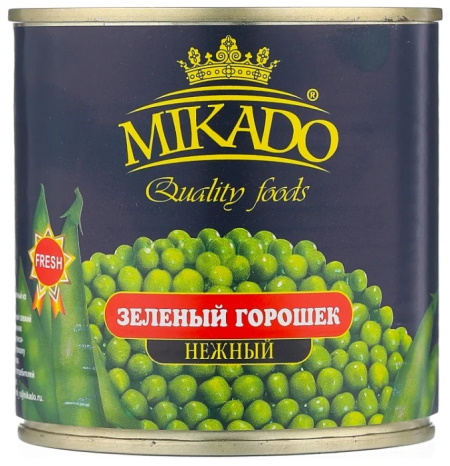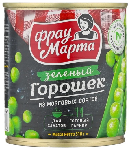 Produit naturel en conserve à base de pois de haute qualité. Un produit à la texture dense et juteuse a un goût modérément sucré. Bon en accompagnement de plats chauds ou en accompagnement, il peut être ajouté à une vinaigrette ou une salade, des sauces ou des soupes, ou consommé seul.Un type de bocal inhabituel d'un volume de 310 grammes avec la fonction d'une clé intégrée pour l'ouvrir.