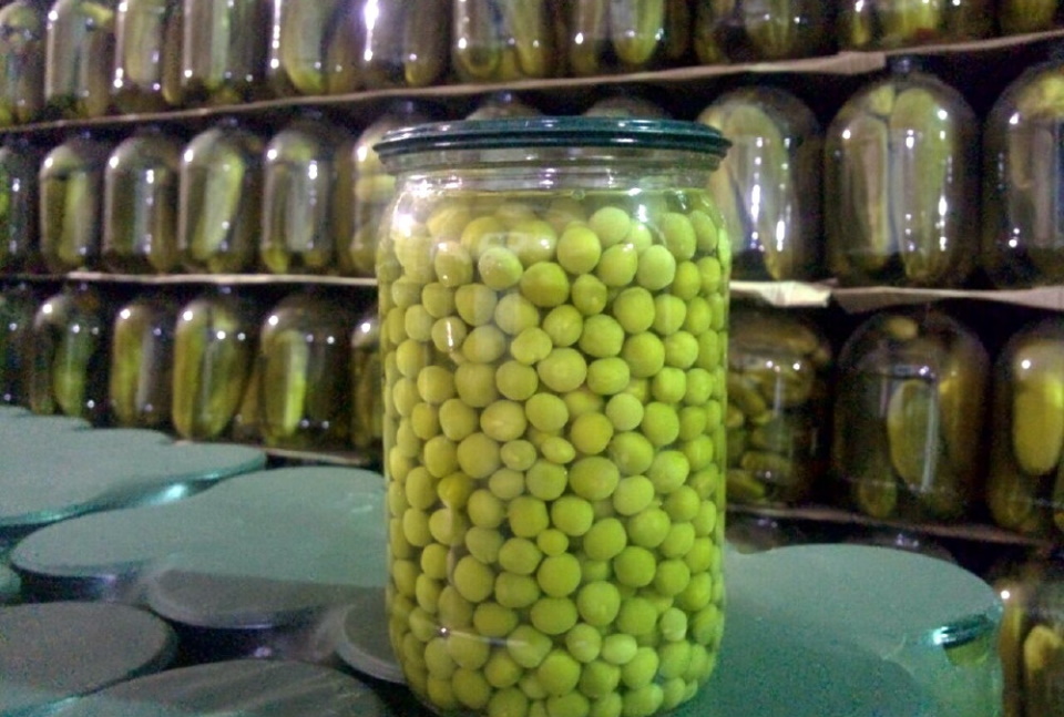 Les pois verts de la cervelle ou de la variété à grain lisse pour la mise en conserve sont achetés au marché ou cultivés dans le jardin.Après décorticage, les grains sont soigneusement lavés et versés avec de l'eau salée pour faire bouillir pendant quatre à six minutes. Ensuite, le liquide est égoutté et les pois sont à nouveau lavés et disposés dans des bocaux en verre stérilisés d'un volume ne dépassant pas un demi-litre.