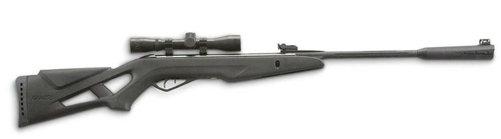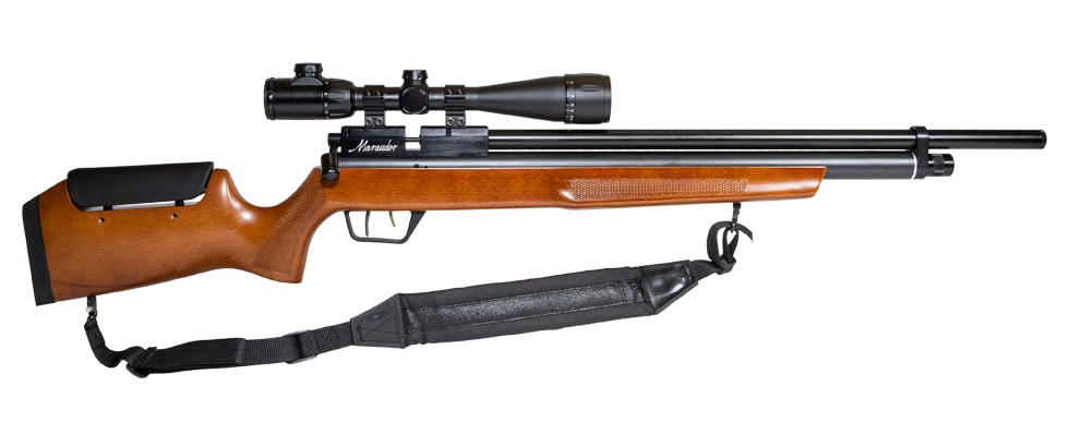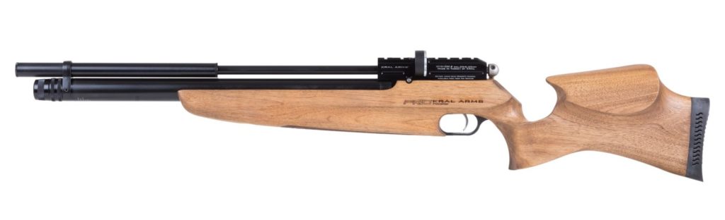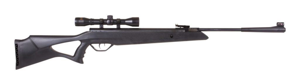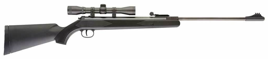 Un modèle classique du fabricant américain Crosman. Le fusil est habillé d'une crosse en bois et équipé d'un chargeur à dix coups.