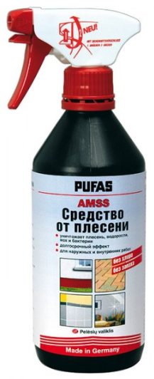 Un spray universel d'un fabricant russe convient au traitement de toutes les surfaces. La popularité du modèle est due à l'absence de métaux lourds, de chlore et de mercure dans sa composition. Produit non parfumé. Avant de traiter les zones gravement touchées, il est recommandé de les nettoyer au préalable avec un grattoir. Vaporiser la préparation à une distance de 30 cm ou appliquer à l'éponge, laisser poser une journée, rincer. Si nécessaire, répétez la procédure. Un paquet suffit pour 4 m².