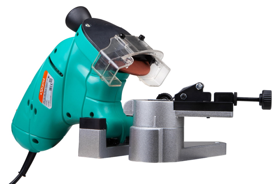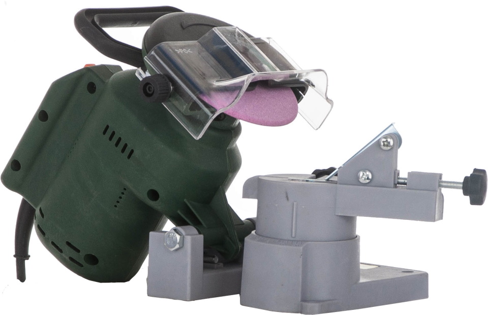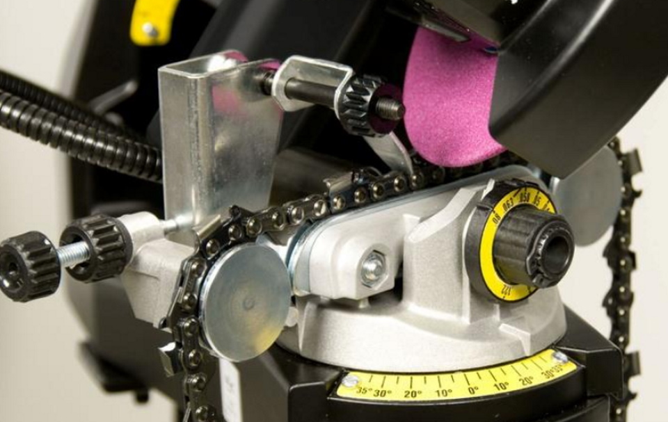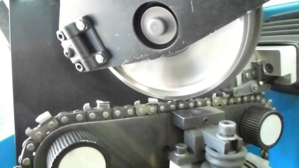L'étau rotatif fixe la pièce de scie et chaque dent est traitée séquentiellement par l'affûteur fourni. L'angle requis est défini indépendamment par l'opérateur par le pas entre les maillons. En règle générale, l'épaisseur du cercle est de 3,5 à 4,0 mm.