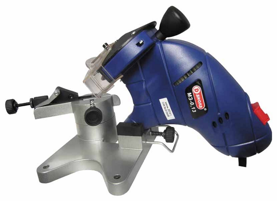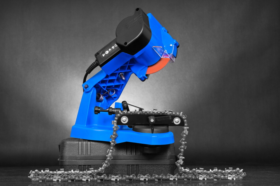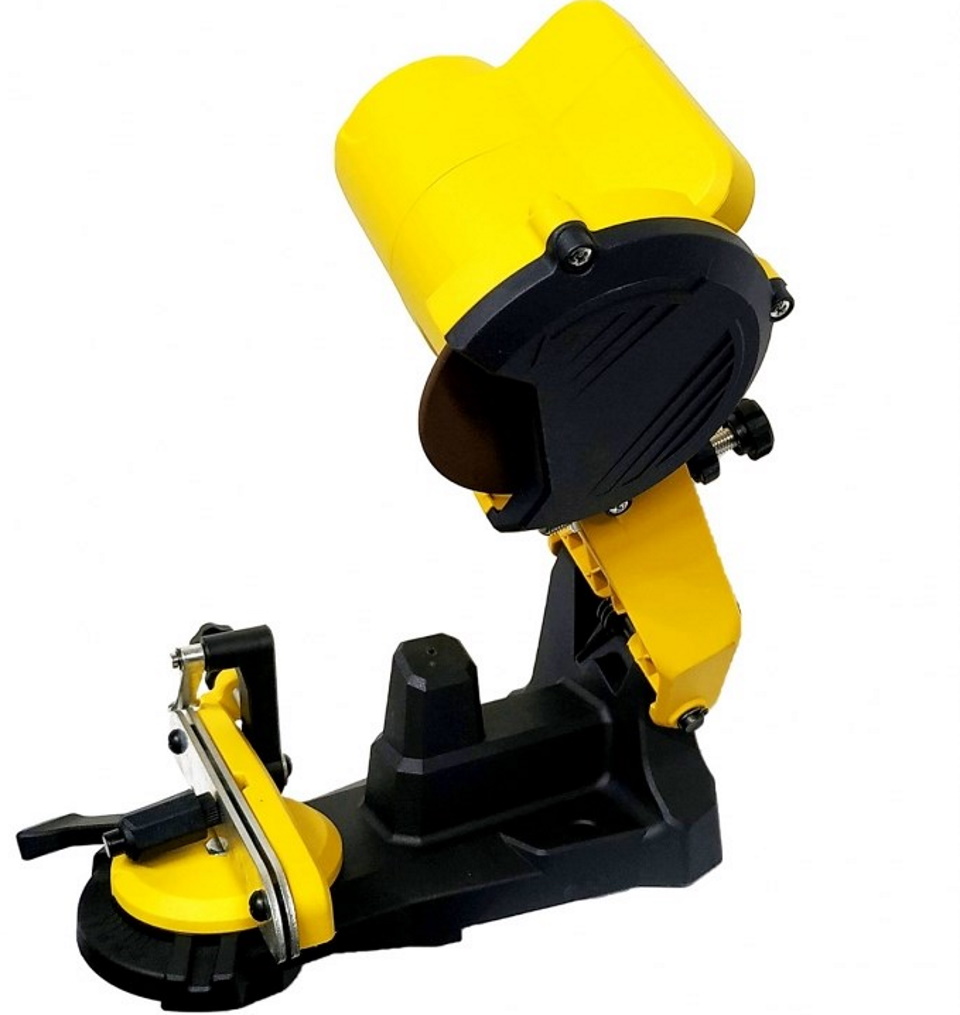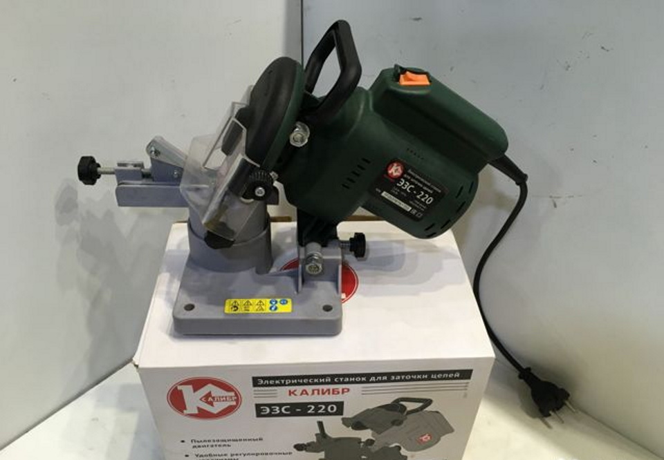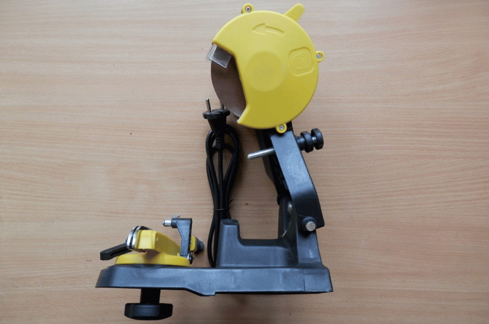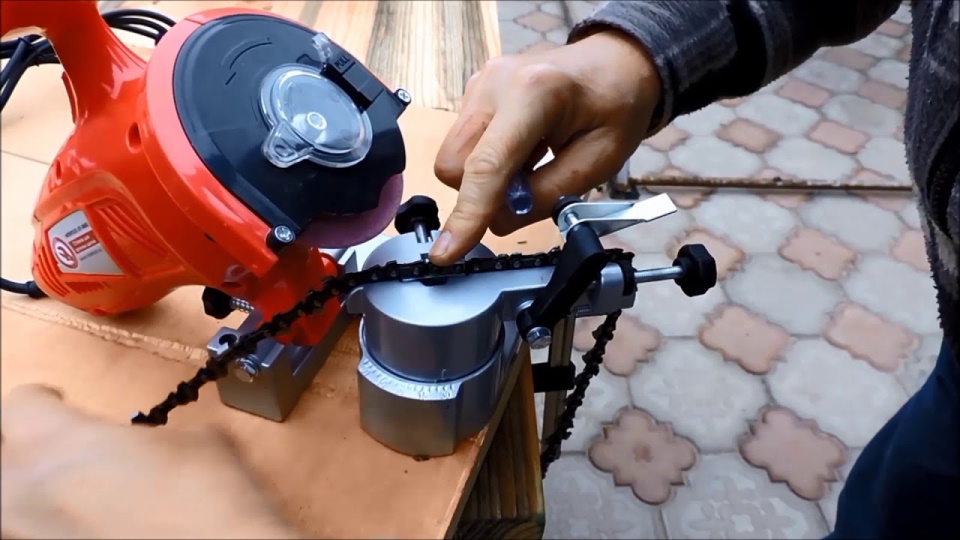 La puissance du moteur doit être faible et lui-même est fixé sur le châssis. La chaîne est fixée avec un gabarit spécial et un moteur avec un affûteur rotatif est amené manuellement à chaque dent.