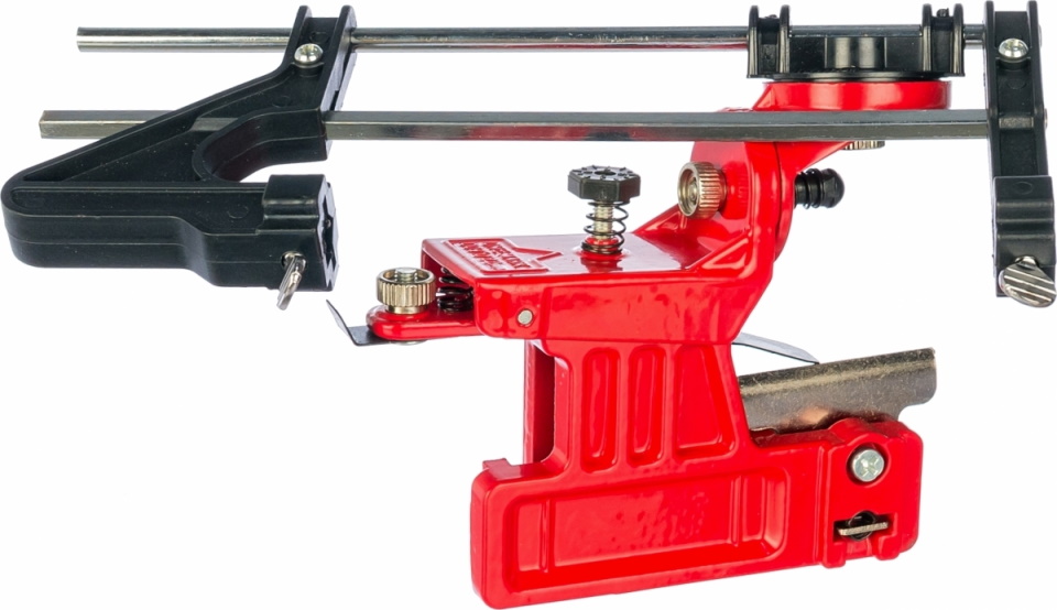 Petit dispositif manuel d'affûtage rapide directement sur la barre. Fixé des deux côtés avec des vis sécurisées. L'angle peut être modifié en fonction des graduations en degrés. À l'aide de la poignée de mesure, vous pouvez fixer l'élément de scie.