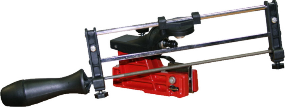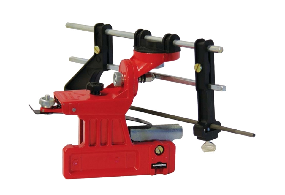 Appareil portatif universel pesant 730 grammes, adapté à tous les types de tronçonneuses. Il est possible d'installer des limes rondes de diamètres appropriés : 4,0 - 5,5 mm.