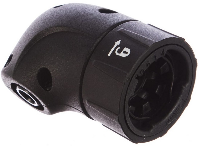 Directement sur le corps, il y a une pièce pour installer l'adaptateur à angle droit, dans laquelle les douilles pivotantes sont situées l'une dans l'autre. Ils sont installés à l'intérieur du boîtier. Cette position assure une bonne rotation et ne produit pas de bruit excessif.