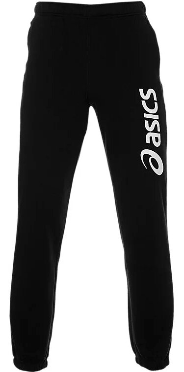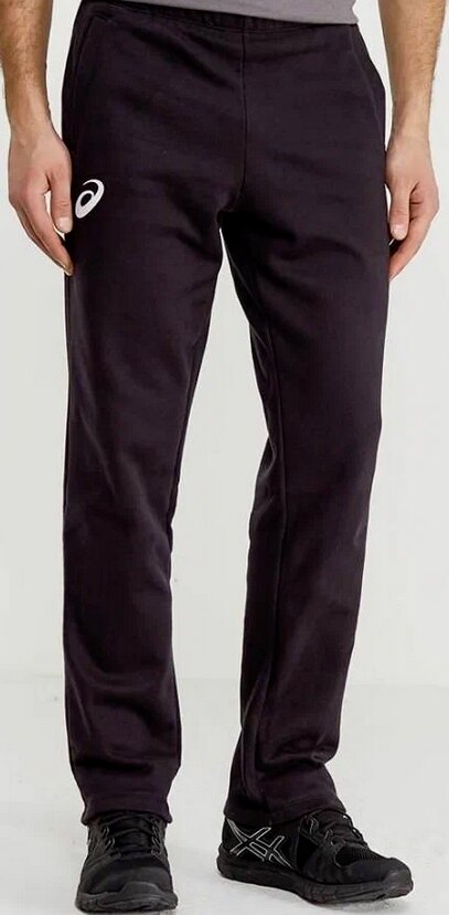 Pantalon de survêtement noir classique. Jambes droites sans revers. La ceinture a une large bande élastique et est réglable avec un cordon de serrage interne. Deux poches sont situées sur les côtés. Il y a un logo d'entreprise près de la poche droite, sur le devant.