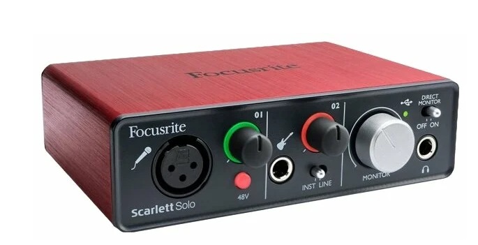 Il y a une entrée microphone avec un préampli et une alimentation fantôme jusqu'à 48 V. Il y a une entrée ligne pour connecter des instruments. Il y a une indication tricolore pour chaque entrée qui signalera une surcharge. Le panneau avant dispose d'un contrôle du volume et d'un bouton d'activation du moniteur. La sortie casque a son propre réglage de volume. La connexion à un ordinateur s'effectue via un câble USB, il est possible de travailler avec les systèmes d'exploitation Windows et MAC OS.
