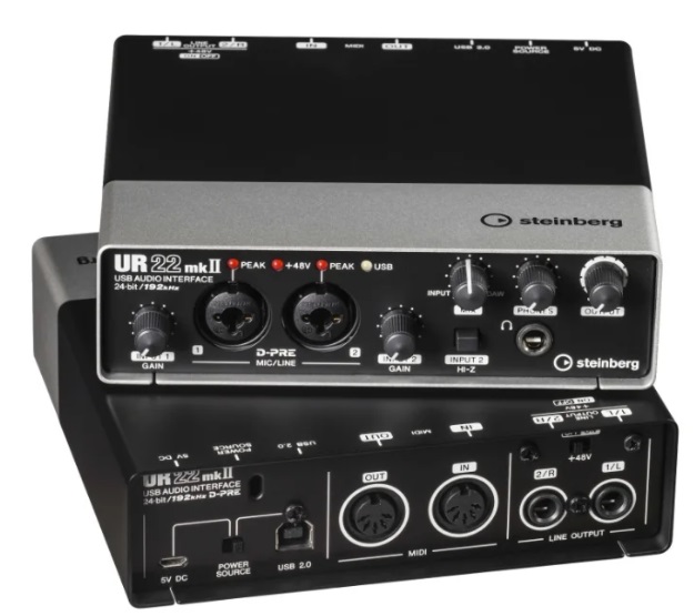 La carte son a un boîtier en métal durable qui protège de manière fiable contre tout type d'impact physique. Il y a 2 préamplis micro avec alimentation fantôme. L'interrupteur d'alimentation fantôme est situé à l'arrière de la carte. Également sur le panneau arrière, vous pouvez trouver une entrée et une sortie MIDI, une sortie ligne et une entrée pour la connexion. Il y a des indications d'alimentation et de contrôle de surcharge.Le panneau avant a une entrée ligne combo, il est utilisé pour connecter un microphone, une guitare ou une basse. La prise casque possède son propre réglage de volume. Il y a une entrée pour une alimentation externe, ce qui fait de l'UR22mkII une carte son indépendante et mobile.