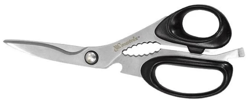 În plus, foarfecele Multidom sunt echipate cu un deschizător și un spărgător de nuci. Piesa de lucru este realizata din otel inoxidabil rezistent la coroziune. Lamele au o zonă zimțată. Mânerele produsului sunt fabricate din polipropilenă. Costul mediu este de - 163 de ruble.