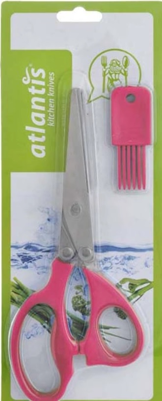 Acest model de asistent de bucătărie este realizat din oțel de înaltă calitate. Cinci perechi de lame de scule sunt ascuțite manual. Mânerele sunt confortabile, echipate cu inserții din silicon anti-alunecare. „Atlantis” sunt concepute pentru tocat ierburile proaspete, dar trebuie remarcat faptul că aceste foarfece sunt, de asemenea, convenabile pentru a tăia șuncă, ciuperci, salată proaspătă și alte produse de densitate și grosime medie. Setul include o perie de silicon pentru curatare. Culoarea modelului este roșie, lungimea este de 21 cm. Costul mediu este de 309 ruble.