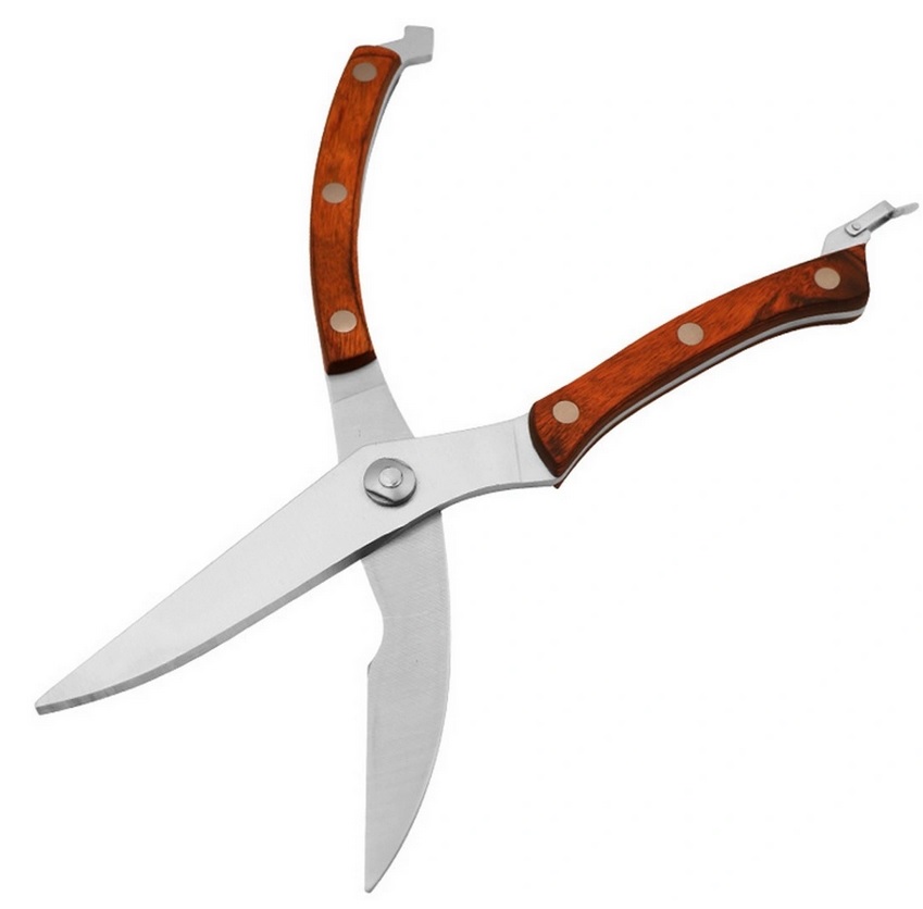 Accesoriu de bucatarie cu manere ergonomice din lemn, din otel inoxidabil de calitate superioara. Instrumentul este puternic, puternic, potrivit pentru măcelărirea păsărilor de curte sau a păsărilor sălbatice, a peștilor mici sau mari. În plus, pentru a crește nivelul de siguranță în timpul funcționării, „BUTA” sunt echipate cu un încuietor de blocare. Piesa de tăiere are o zonă zimțată, astfel încât dispozitivul demonstrează o capacitate ridicată de tăiere. Greutate "BUTA" - 280 g, lungime cu lame - 255 mm. Disponibil în culoare argintie. Costul mediu este de - 599 de ruble.