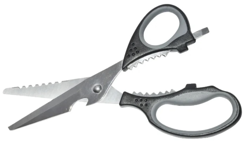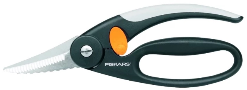 Foarfece de tăiere concepute pentru a lucra cu pești mici sau mari, îndepărtează aripioarele, solzii, coada. Zona zimțată de pe partea de tăiere contribuie la tăierea precisă și rapidă a oaselor. Mânerele sunt fabricate din plastic durabil de înaltă calitate, sunt confortabile pentru dreptaci și stângaci, stau confortabil în mână, nu alunecă în timpul funcționării. Există o buclă specială pentru degetul mare. În plus, modelul este echipat cu un mecanism de blocare care este ușor de activat cu un singur deget.Instrumentul de bucătărie FISKARS „Functional Form” poate fi spălat în mașina de spălat vase la o temperatură care să nu depășească 137 de grade. Lungimea lamelor este de 7 cm. Costul mediu este de 1.984 de ruble.
