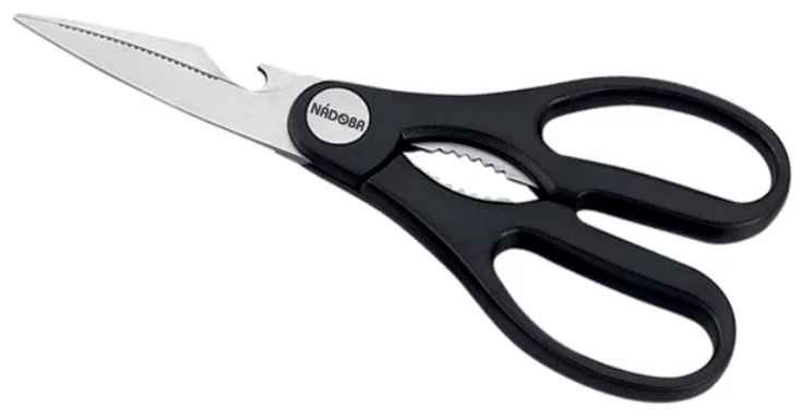 Modelul clasic de foarfece universale de bucătărie cu un deschizător și un spărgător de nuci situat pe mânere. Aparatul este fabricat din materiale durabile - oțel inoxidabil și plastic de înaltă rezistență. Fixarea este fiabilă, șurub. Nadoba „Borga” ajută nu numai la măcelarea păsărilor de curte, a peștelui, ci și la deschiderea sticlelor și a borcanelor (deșurubați sau îndepărtați capacele), spargeți nuci.Lungimea piesei de tăiere este de 20 cm, există o zonă zimțată. Greutatea produsului 275 g. Costul mediu al instrumentului este de 349 de ruble.