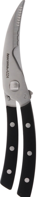 Accesoriul de bucătărie Tescoma "Azza" este conceput pentru măcelărirea păsărilor de curte. Fabricat din oțel inoxidabil de înaltă calitate, rezistent la coroziune sau pete. Mecanismul puternic și cuțitele ascuțite fac o treabă bună în tăierea oaselor, tăierea pielii de pui și, de asemenea, tăierea alimentelor destul de dure. Tescoma "Azza" poate fi folosit ca foarfece obișnuite de uz casnic pentru o varietate de nevoi casnice. Mânerele sunt realizate din plastic rezistent, au o formă ergonomică, făcând produsul confortabil și sigur de utilizat. Lungimea lamelor este de 9,5 cm. Costul mediu al unui accesoriu este de 2.230 de ruble.