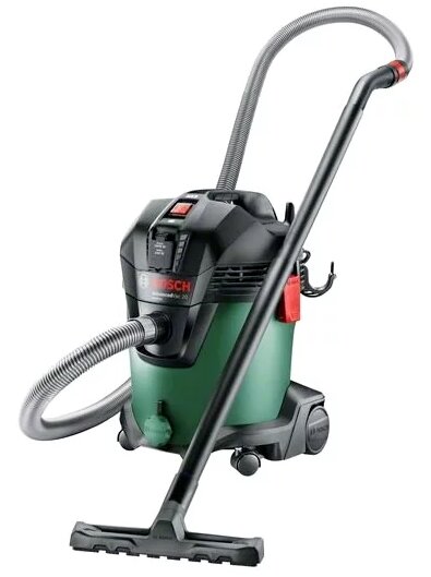 Set: furtun flexibil 2,5 m (diametru 35 mm), sârmă 7,5 m, duze (pardoseală, crevașă), filtre (fleece, pliuri de hârtie), roată pivotantă, frână.