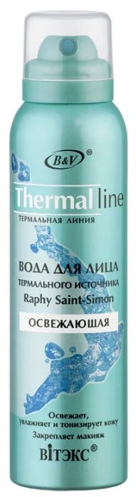 La baza liniei Termale de la Belita-Vitex se află materiile prime de apă din sursa Raphy Saint-Simon Est, situată în Alpii francezi. Apa aparține ionilor slab mineralizați, dintre ingredientele active predomină calciu, magneziu, sodiu, potasiu, precum și bicarbonații și sulfații. Producătorul nu indică nivelul exact de mineralizare și pH, așa că este dificil de determinat pentru ce tip de piele este conceput produsul.Ambalat într-o sticlă metalică de 150 ml.