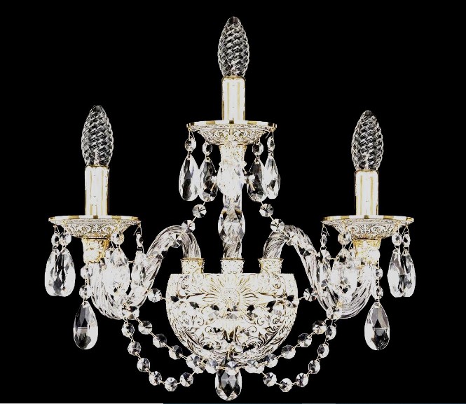Luxusný výrobok českej výroby s kovovým rámom zlatej farby. Tri rohy imitujú svietniky. Zdobené veľkými krištáľovými príveskami. Podľa pokynov je inštalácia zariadenia celkom jednoduchá.