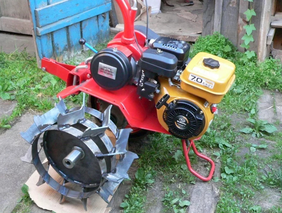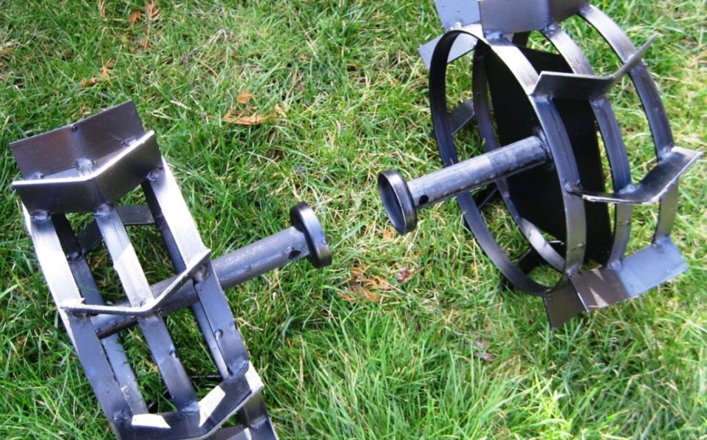 Inköpt till Champion BC 4401 - en liten hemkultivator. Hjuldiametern är endast 29 cm, bredd - 9. De är fixerade på växellådans axlar med en bussning och istället för konventionella hjul. Den används på lös jord för plöjning och lossning. För små trädgårdar och trädgårdstomter. Tillverkad av 3 mm höghållfast stål för lång livslängd. Inte lämplig för lerjordar.