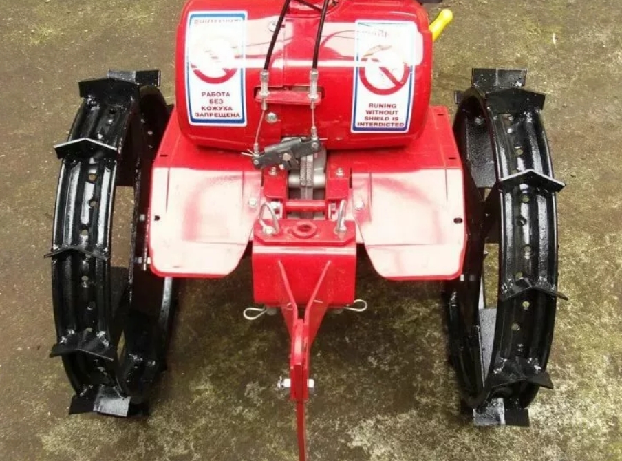 Designad för Celina 404, 406, Tarpan, Mole, Ranch, Elitech KB-51 och KB-52. Förbättrar greppet med marken, hjälper till att använda extra utrustning för plöjning, lossning och backning. Spikarna är säkert fastsatta på enheten med en bussning till växellådans axel. Diameter - 34 cm, bredd - 9,5 cm De används i personliga trädgårdar, de är inte rationella för stora ytor.