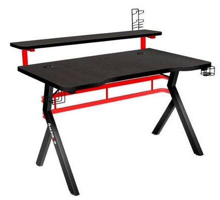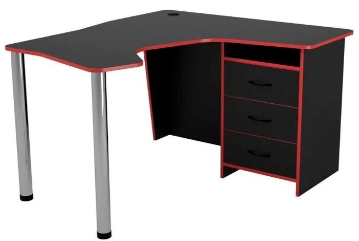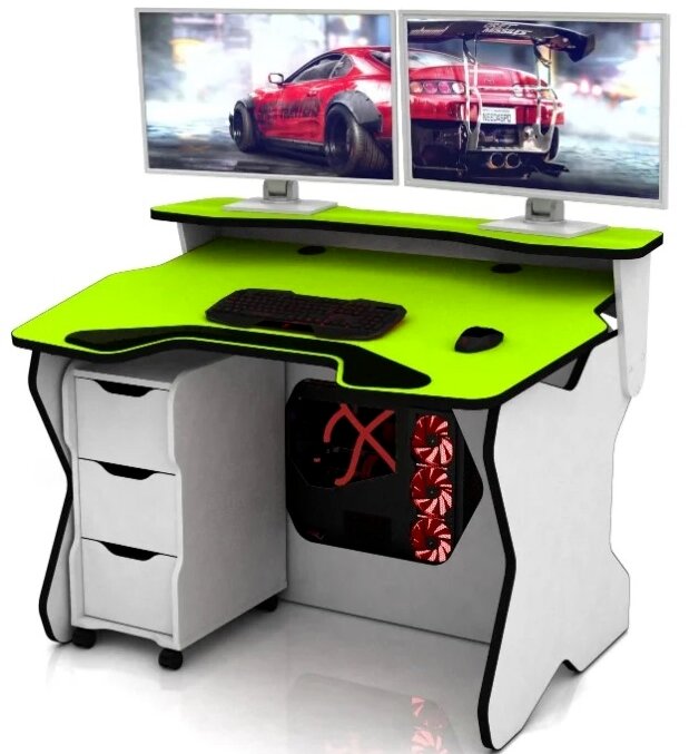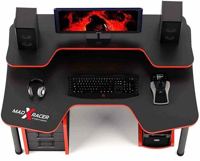 Ryska märket MaDXRacer. Den består av en stor bordsskiva med ett bekvämt urtag, en förlängning, skåp (3 lådor), ett PC-ställ.Det finns två metallfötter på framsidan (vänster, höger).