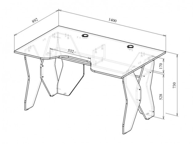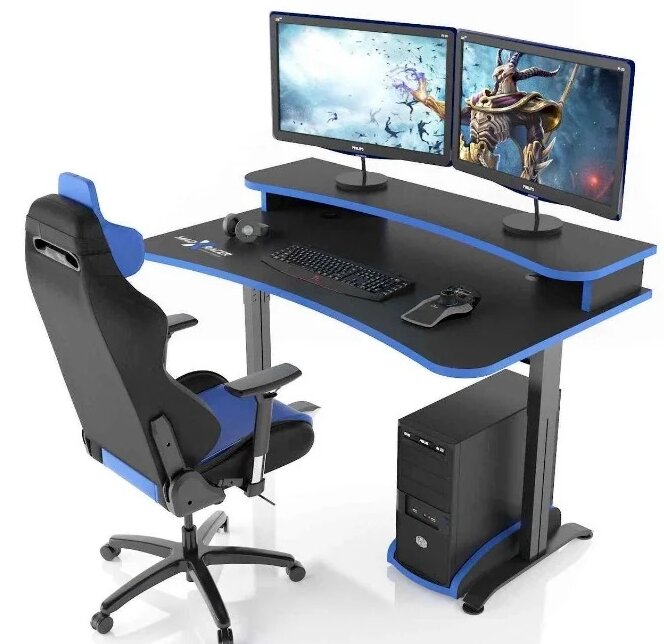 Rymligt bord med tillägg för 2 displayer, 3 lådor (A4-format). Två justerbara metallfötter framtill, vänster och höger. Smidig utskärning av huvudpanelen, tillägg. Särskilda mjuka ortopediska dynor för armbågar.