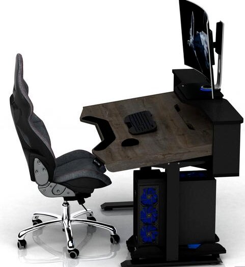 Modernt ryskt företag MaDXRacer. Modell för professionell e-sport. Den består av en stor bordsskiva (slät fördjupning av den främre delen), basen är en metallram, en förlängning för bildskärmar, ett stativ för systemenheten.