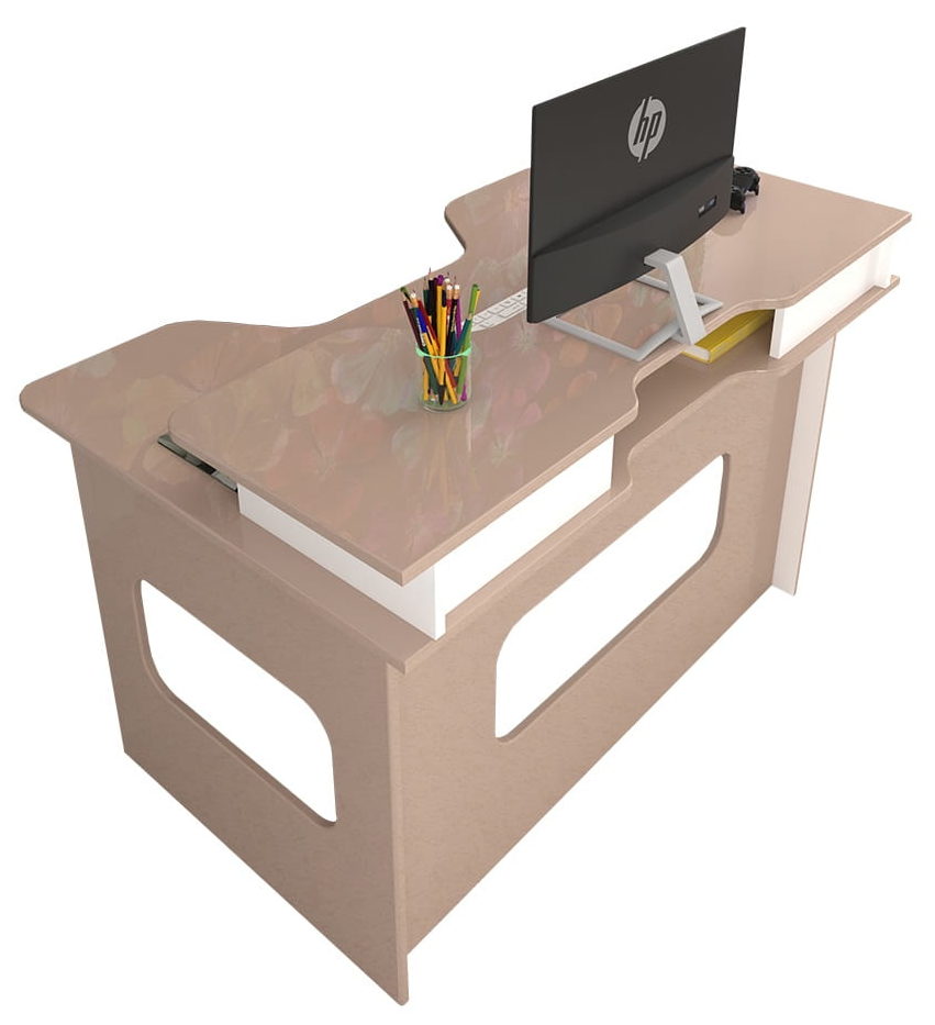 Tillverkare är MERDES möbelfabrik. Den består av en rymlig yta, en förlängning, två justerbara metallstöd (framsida, vänster, höger), sidoytor. Djup skåra i framsidan av bordsskivan, öppning (kablar för tangentbord, bildskärmar).