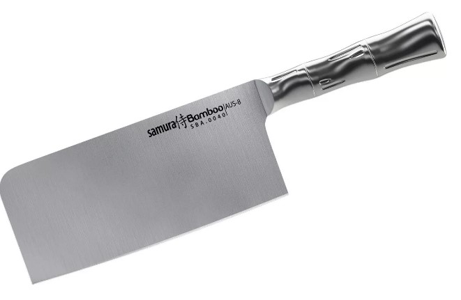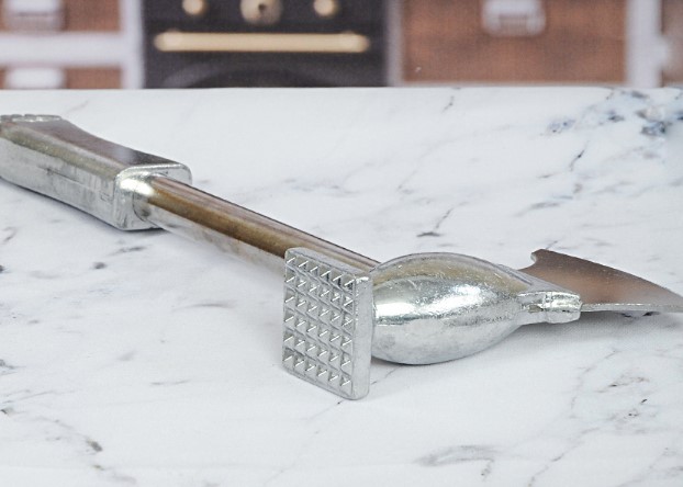En rysktillverkad produkt gjord av aluminiumlegering med ett insvetsat stålblad hjälper dig att snabbt och enkelt skära fågel, kött eller fryst fisk. Det är dock obekvämt att skära stora bitar på grund av den lilla längden på skäreggen. Den andra sidan är avsedd att slå till ett saftigt och mört tillstånd. Modellen är dekorerad med ett reliefmönster, vilket ger utseendet av attraktivitet.