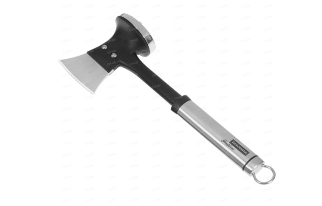 En kinesisktillverkad modell, populär bland kunder på grund av dess komfort och hållbara material.Hammarens huvud, yxans blad och den del av handtaget som greppet är gjord för är gjorda av rostfritt stål, som inte utsätts för korrosion och mekaniskt slitage. Den mittersta delen av handtaget är tillverkad av särskilt slitstark svart plast, till vilken bladet är säkert fäst med nitar. Produkten kan diskas i diskmaskin, särskild skötsel krävs inte. Tillverkaren ger en garanti på 36 månader, men i själva verket håller verktyget mycket längre utan förlust av funktionella egenskaper och utseende. Handtagets struktur och form ger ett bekvämt grepp. Det finns ett hål för upphängning på väggen för förvaring. Produkten säljs i ett skyddsfodral.