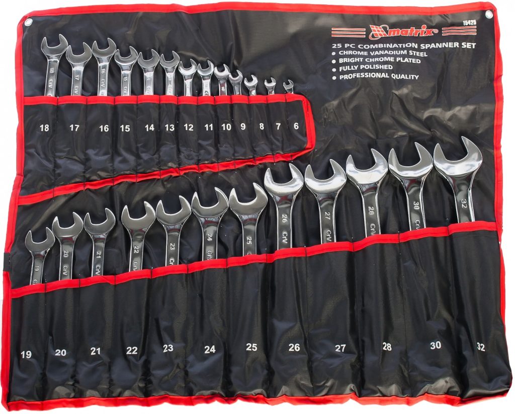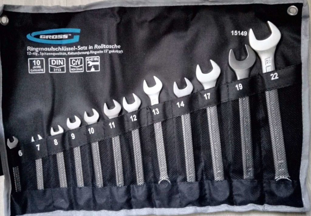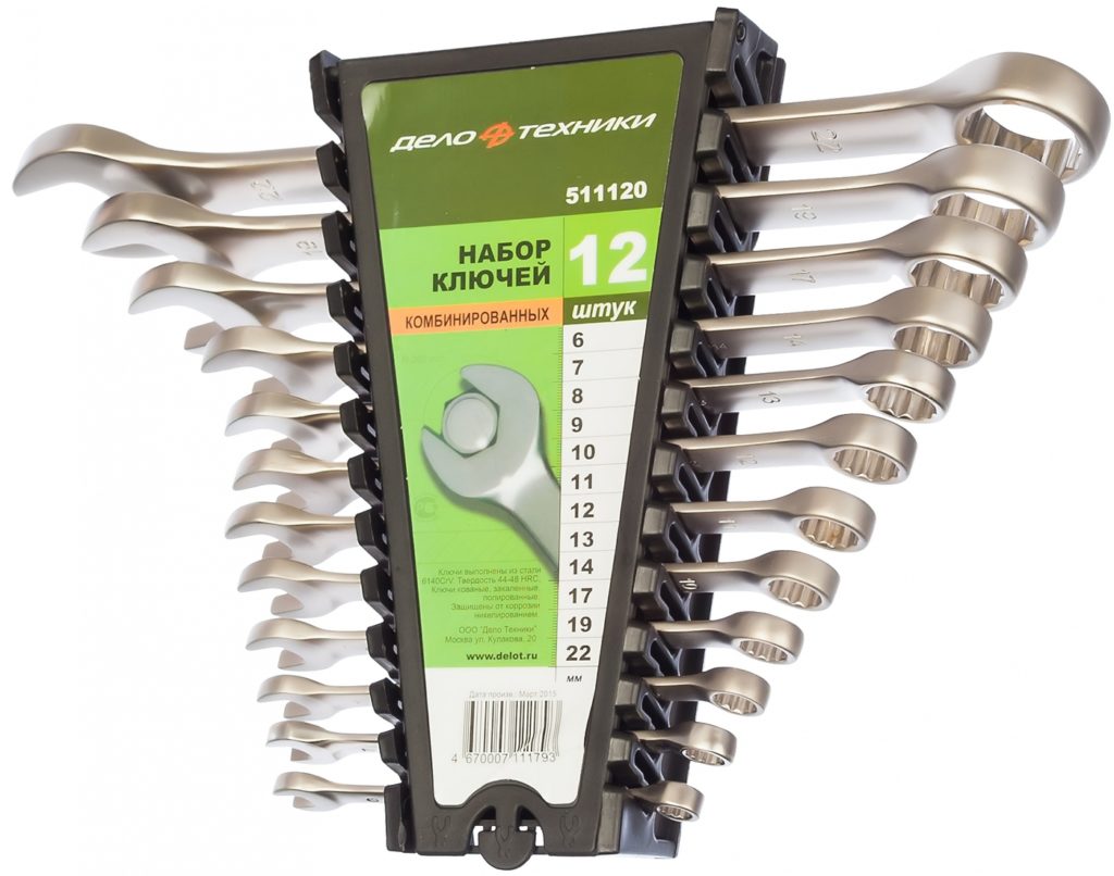 Gross Universal Tool Kit erbjuder ett urval av monteringsverktyg i olika storlekar. Dessa enheter är användbara för montering och demontering som involverar interaktion med anslutningar, till exempel gängade.Enheter tillverkades enligt kallstämplingstekniken med legeringar baserade på stål, krom och vanadin. Densitet och hårdhet uppfyller internationella standarder för denna typ av produkt. Enheterna har en enhet med dubbel ände (arbetande och extra). Arbetsänden är utrustad med en hornanordning, och hjälpänden är ringformad. Den ringformade spetsen är böjd 15° i förhållande till den allmänna nivån, detta görs för att uppnå största möjliga bekvämlighet vid hantering av muttrar och bultar. För att uppnå den längsta livslängden och motståndskraften mot rost försåg tillverkaren produkterna med en krom- och nickelbeläggning. Satsen väger 1,2 kg, storleksintervallet är i intervallet från 6 till 22 mm., Det finns till försäljning till ett genomsnittligt pris av 1700 rubel.