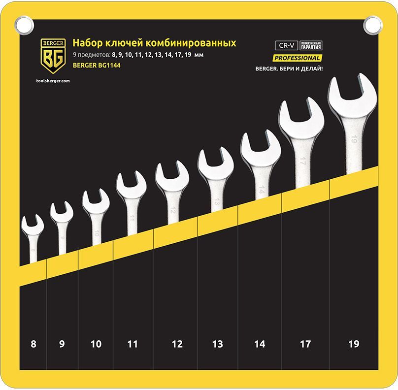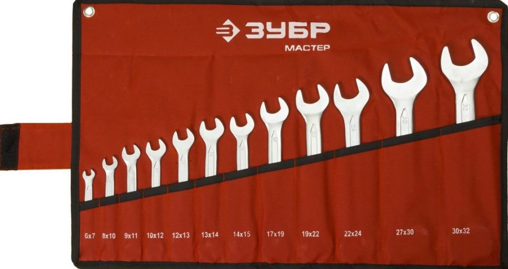 Denna montering är gjord i ett fodral med separata fack för att hålla verktyg. Tekniska hål gör att du kan placera locket på ett bekvämt arbetsområde för att snabbt ta bort den önskade kopian. För portabilitet har fodralet en kardborreyta som gör att enheten kan bäras stängd. Storleksintervallet ligger i intervallet från 8 till 19 mm., med en vikt på 1,3 kg användes legeringar av stål, vanadin och krom vid tillverkningen (vilket ger den största tillförlitligheten till den övergripande designen). För motståndskraft mot rost och andra influenser försåg tillverkaren produkterna med en skyddande beläggning. Det finns till försäljning till ett genomsnittligt pris av 1199 rubel.