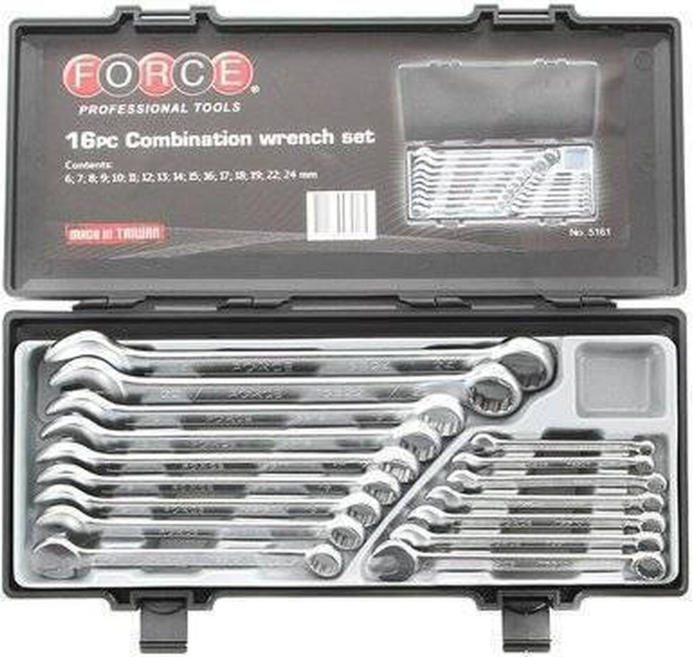 Denna enhet säljs i ett hårdplastfodral. Detta ger extra komfort när det gäller att hålla instrumentet och bära det. Fodralet ger urtag för placering av enheter, varje cell är markerad för bekväm navigering. Det finns 16 nycklar i lådan i storleksintervallet 6-24mm, tillverkade av stål, resistenta mot ökad belastning. Tillgänglig för försäljning till ett genomsnittligt pris av 3529 rubel.