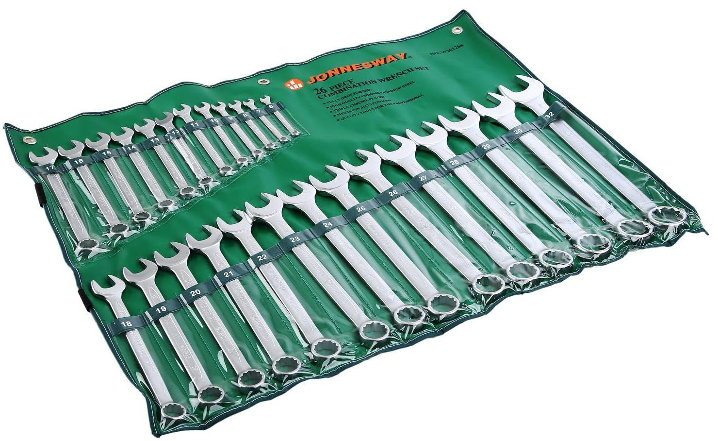 Tillverkaren utrustade församlingen med 26 nycklar av de vanligaste formaten, vilket gör att befälhavaren kan komma igång med arbetet utan att tveka: nyckeln med önskad storlek finns säkerligen i paketet. Produkten är gjord av höghållfast stål, som ett extra skydd appliceras ett skyddande lager av krom på kroppen. I storleksintervallet erbjuds enheter från 6 till 32 mm., Monteringen väger ca 5 kg., Ett fodral av slitstarkt tyg tillhandahålls som fodral. Stängda underkläder är tillåtna, detta är möjligt tack vare den integrerade kardborreknäppningen. Platser för en specifik enhet är markerade för att underlätta navigeringen. Det finns till försäljning till ett genomsnittligt pris av 13 950 rubel.