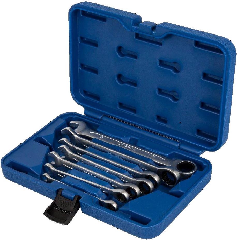 Setet är tillverkat av ett starkt legerat stål, vilket gör nycklarna stabila även framför en imponerande last. Den ringformade spetsen är utrustad med mekanik av spärrtyp, så arbetets prestanda med hjälp av hjälphuvudet ökar avsevärt. Monteringen finns tillgänglig i 7 exemplar, vars storlek är från 8 till 19 mm., Komplett med ett fodral som är resistent mot mekaniska skador och försett med ett säkert lås. Detta tillvägagångssätt för tillverkning av fodralet säkerställer säkerhet vid transport av verktyg och gynnsamma förhållanden för förvaring. Till försäljning finns till en genomsnittlig kostnad av 3990 rubel.
