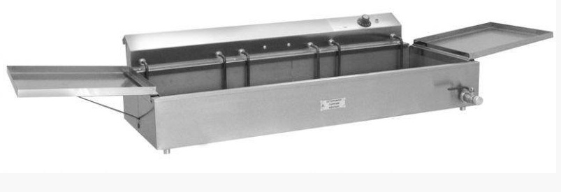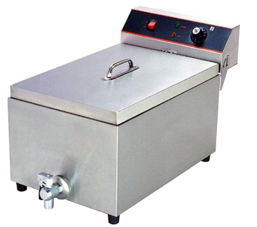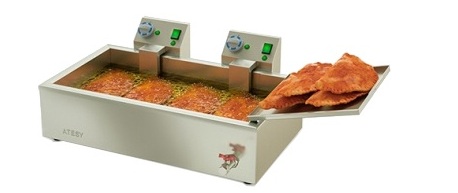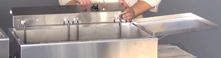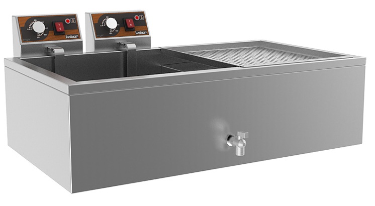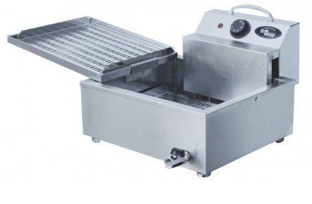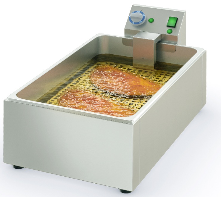 Designen är lämplig för användning i kaféer, barer, bufféer (lämplig för gatan). Den har bra numeriska indikatorer för arbetsprocessen, den är utrustad med en värmesensor som ställer in önskad temperatur. Värmeelementen stängs av två perforerade insatser. Ett avtagbart handtag hjälper till att ta bort den färdiga produkten. Gångjärnsförsett lock, slätt på insidan. Piroger läggs ut på den så att överflödig fritering rinner av dem. Dräneringsventilen gör att du snabbt och bekvämt kan byta ut använd olja.
