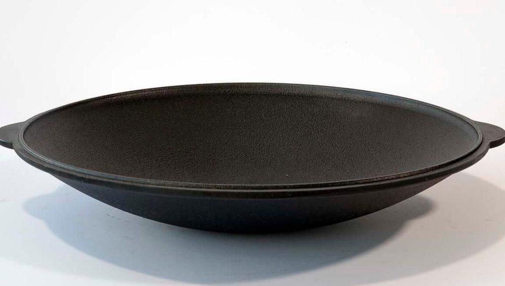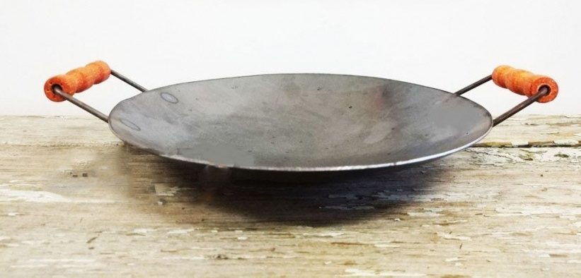 Den ovanliga formen på pannan gör matlagningsprocessen trevlig. Kanterna är vågiga, bekväma handtag finns på sidorna. Produkten kan användas både för matlagning i eld och på vanliga spisar hemma. Produktens diameter är 50 cm, så den kan användas för att laga mat åt ett stort företag. Ofta används också en stekpanna för att servera lagad mat till bordet. Men för sådana ändamål måste du dessutom köpa ett stativ. Vikten är 3 kg.