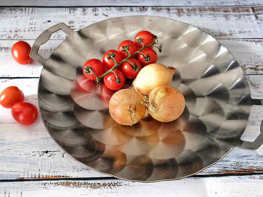Denna maträtt presenteras i form av en skål med stativ. Det kommer att bli en oumbärlig produkt, inte bara för hemmabruk, utan också när du går ut i friska luften. Tillverkad av teflonbelagt rostfritt stål. Stativet är utformat så att vid behov kol från elden kan användas för att värma upp fatet.