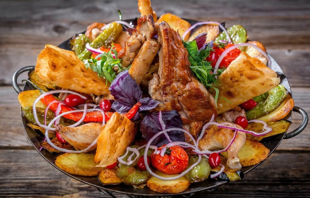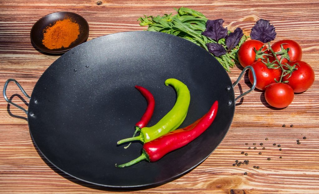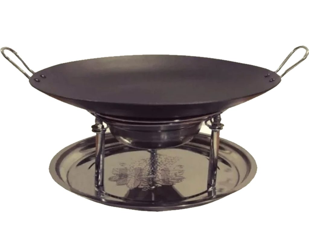 För att den tillagade rätten ska behålla sin smak rekommenderas det att använda en stekpanna tillsammans med ett stativ där heta kol placeras.