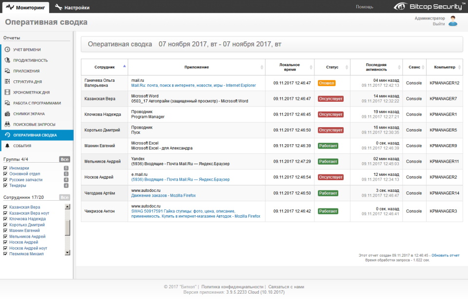 En mjukvaruprodukt av inhemsk utveckling för att registrera arbetstimmar. Applikationen innehåller två moduler som är installerade på chefens och medarbetarens datorer. För att förhindra obehörig störning tillhandahålls molnlagring (på Ryska federationens territorium) av all information. Om det behövs kan systemet blockera misstänkta uppladdningar eller USB-porten. Funktionen ger möjlighet att spåra anställdas aktivitet när som helst, öppna webbplatser eller applikationer. Efter att ha genererat rapporter för en viss tidsperiod kan du analysera personalens produktivitet.