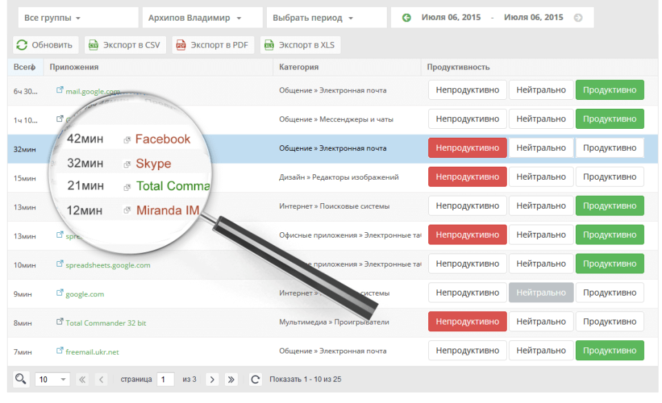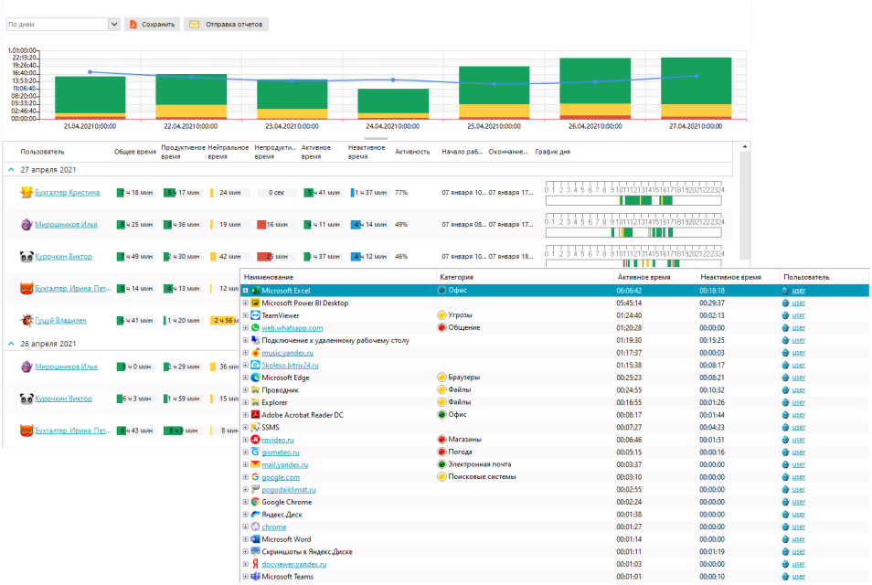 Ett mjukvaruverktyg för att registrera arbetstimmar och analysera arbetseffektiviteten på en dator, som hjälper ledningen att fatta beslut och en anställd i karriärtillväxt. Genererad rapportering baserad på videobilder och skärmdumpar av monitorer låter dig analysera personalens produktivitet. Systemet låter dig klargöra ineffektiva tidsperioder (visa underhållningssajter eller applikationer för personliga ändamål), vilket förbättrar analysen av anställdas arbetsaktiviteter.
