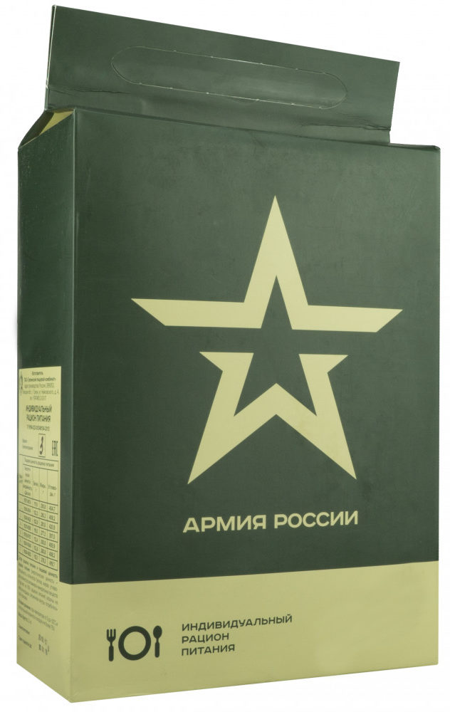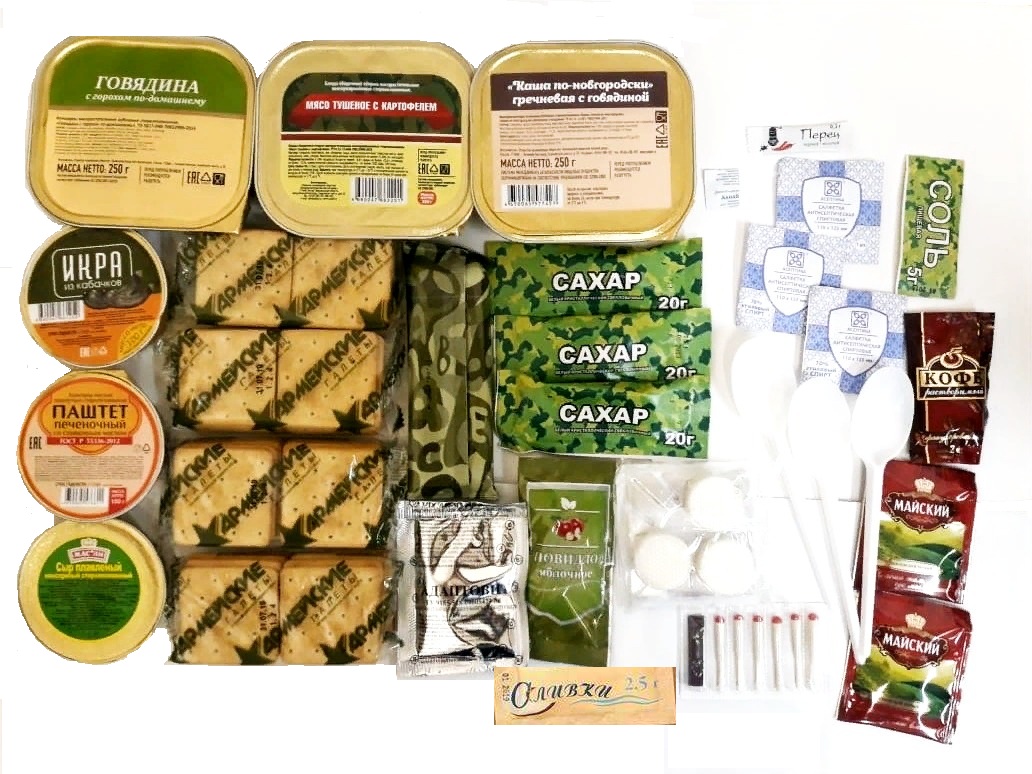 Dessutom kompletteras en individuell kost med kycklingpastej och korvfärs. Båda produkterna väger 100 gram. Smältost i en enda kvantitet som väger 80 gram och armékex gjorda av vetemjöl av första klass - 4 förpackningar som väger 200 gram.