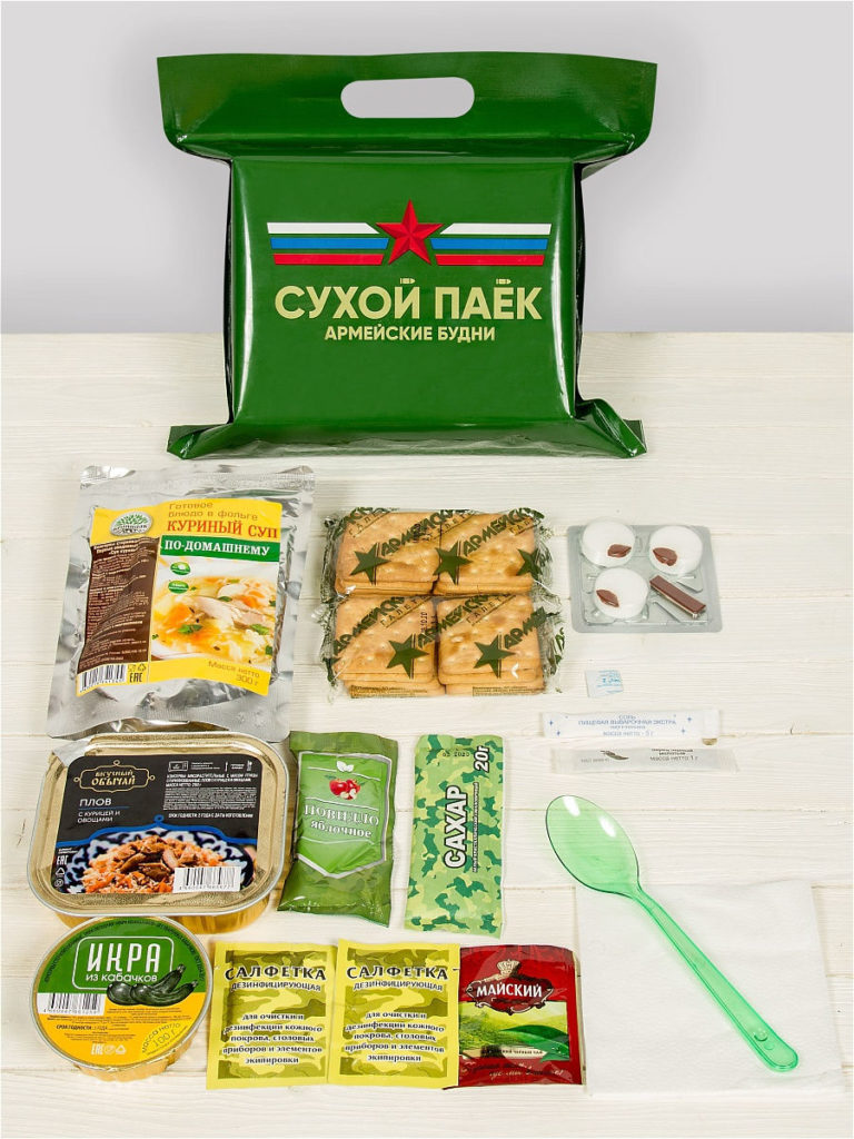 Du kan köpa torra arméransoner för att ersätta lunch på fältet för cirka 500 rubel.